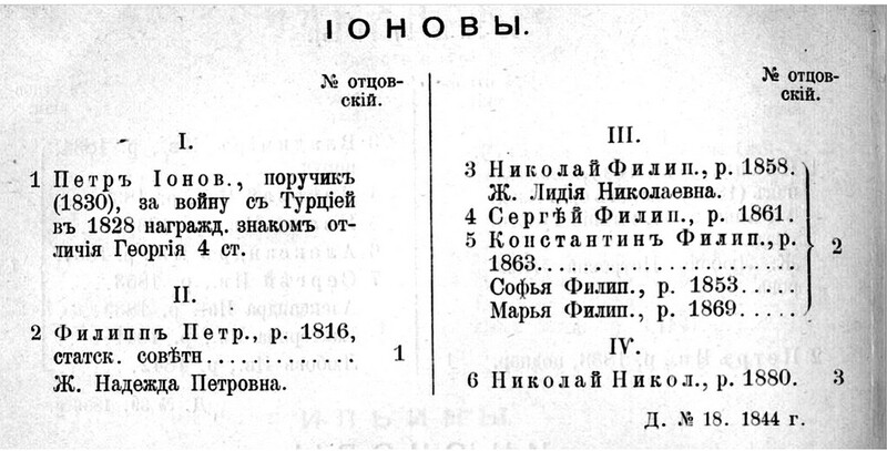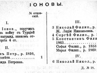 | Родословная военного инженера Ионова Николая Николаевича из Тульских дворян. Родоначальник крепостной рекрут Петр Ионович Ионов, награжденный званием поручика и орденом. |