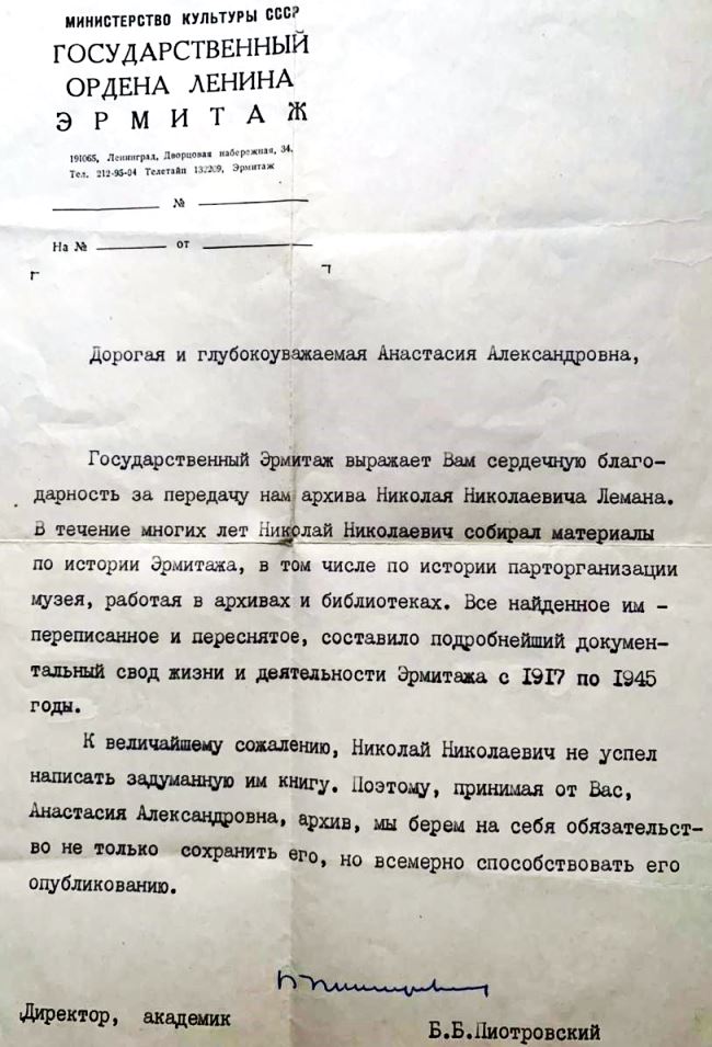 «Наша дружба окрепла в грозные дни начала Великой Отечественной войны, когда курсанты Ленинградского Краснознаменного Военно-инженерного училища оказали нам неоценимую помощь в эвакуации сокровищ мирового искусства из Ленинграда, к которому уже подходили фашистские орды». Из приветственного письма Государственного ордена Ленина Эрмитажа по случаю 50-летия Училища (1968). Подписали директор Государственного Эрмитажа Б.Б. Пиотровский и Секретарь партийного бюро Н.Н. Леман.